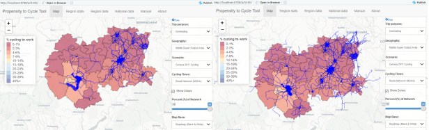For these reasons over the last few months we’ve been preparing an update to the commute layer. The results may be slightly different in some places, for example, if the fast route along a particular desire line becomes shorter, the estimated levels of cycling uptake will increase slightly, reflecting the fact that people are more likely to cycle short distances (assuming there is good infrastructure).